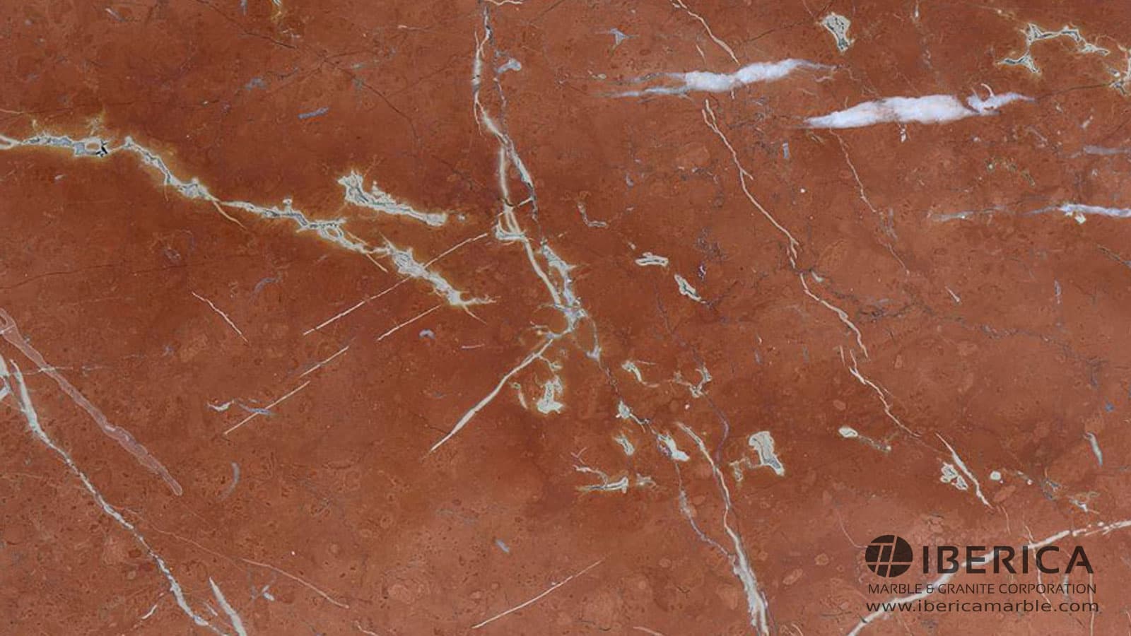 Este mármol es una roca de color rojo pálido, con un veteado blanco de calcita, muy irregularmente repartido, es compacta y tiene un grano fino.